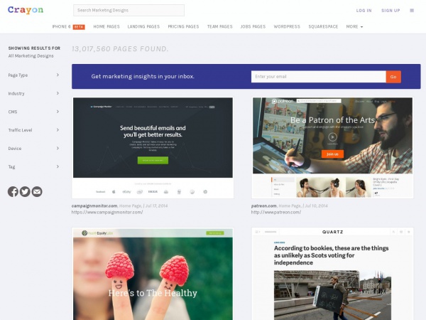 「Marketing Design Search Engine | Crayon」はウェブサイトのデザインギャラリーサイトなんだけど、デバイスの種類別やCMSの種類別、ページの機能別などいろいろなカテゴリー分けがしてあって、目的に応じたデザインを簡単に探し出すことができて非常に便利。